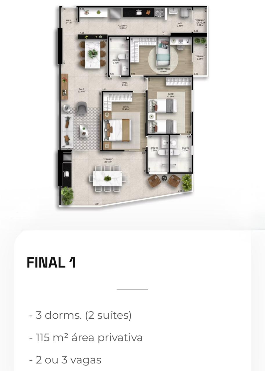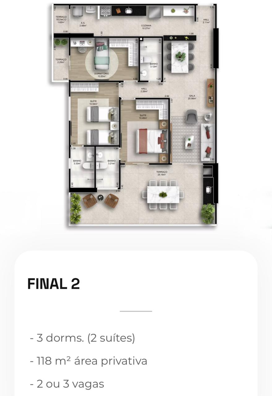 Apartamentos de 2 e 3 dormitórios, de 78 a 118 m², com 2 ou 3 vagas de garagem.