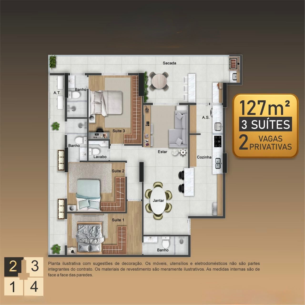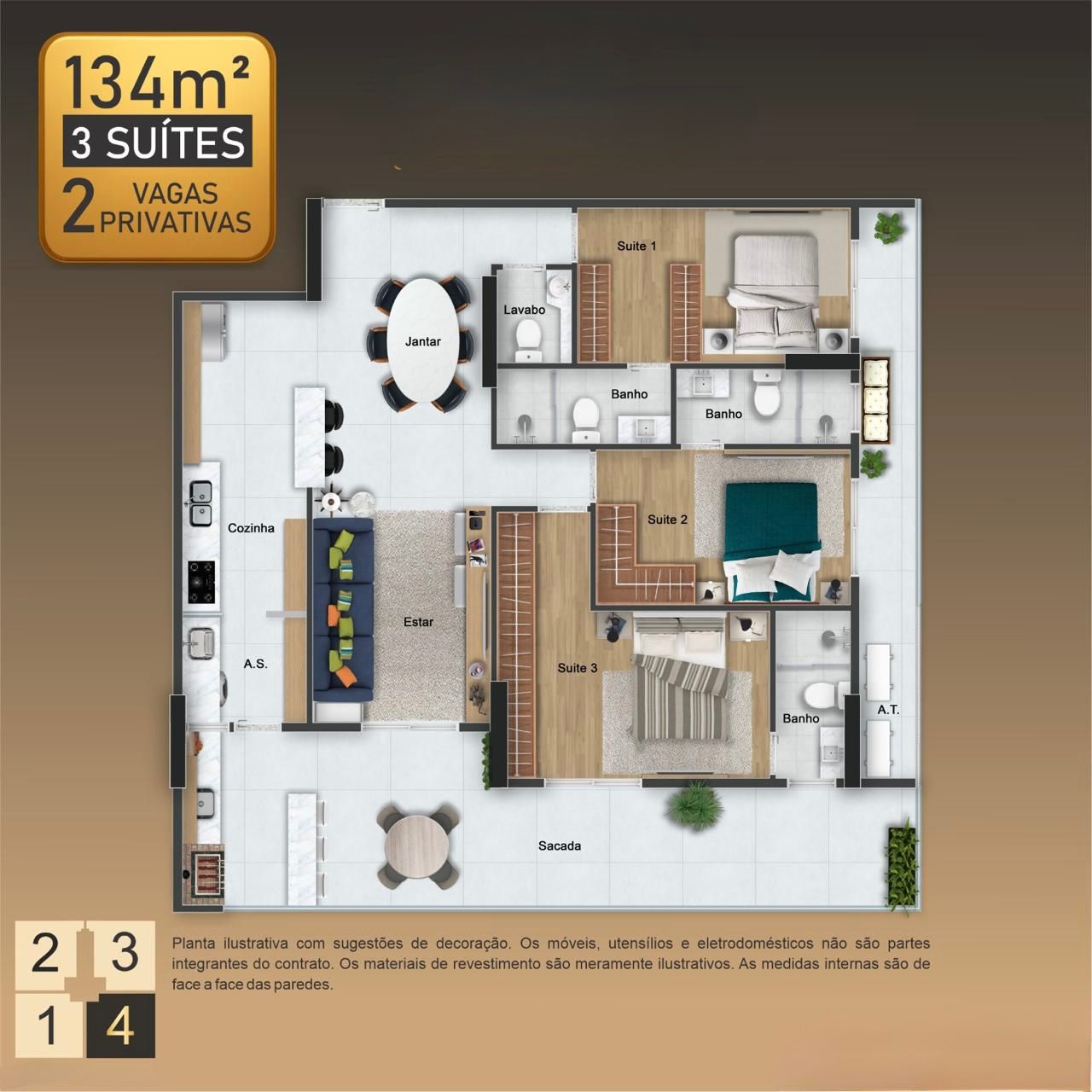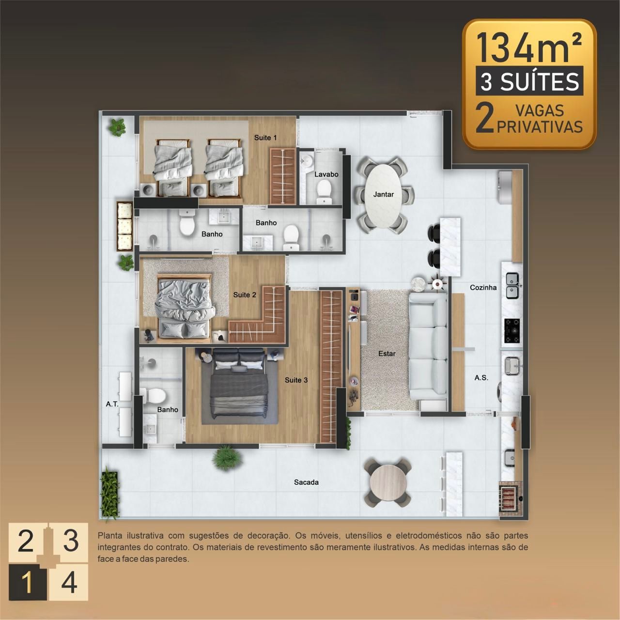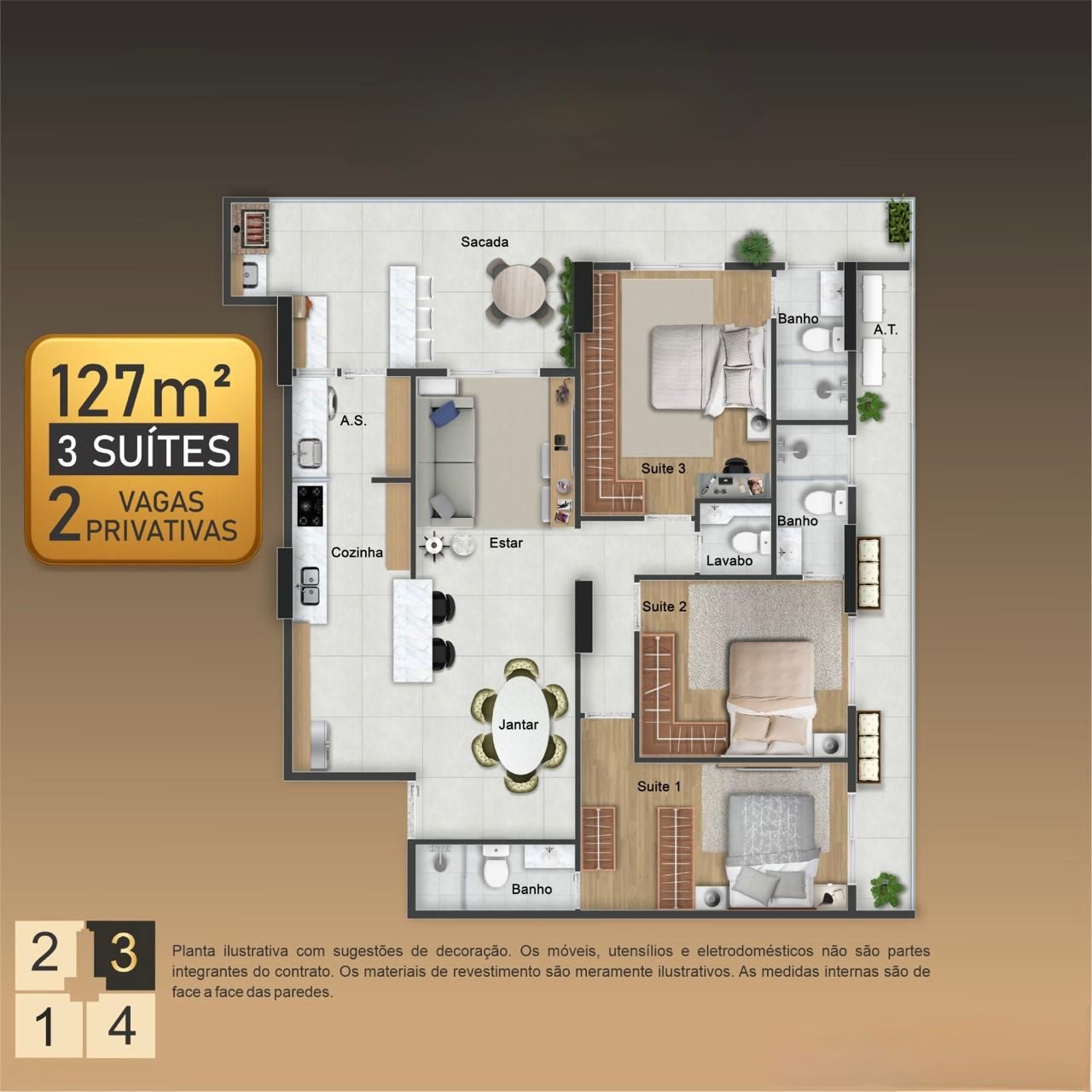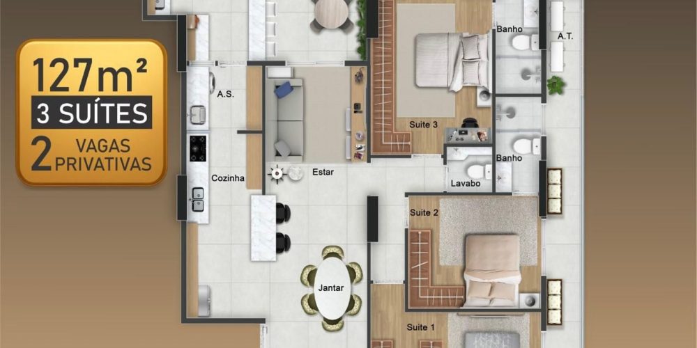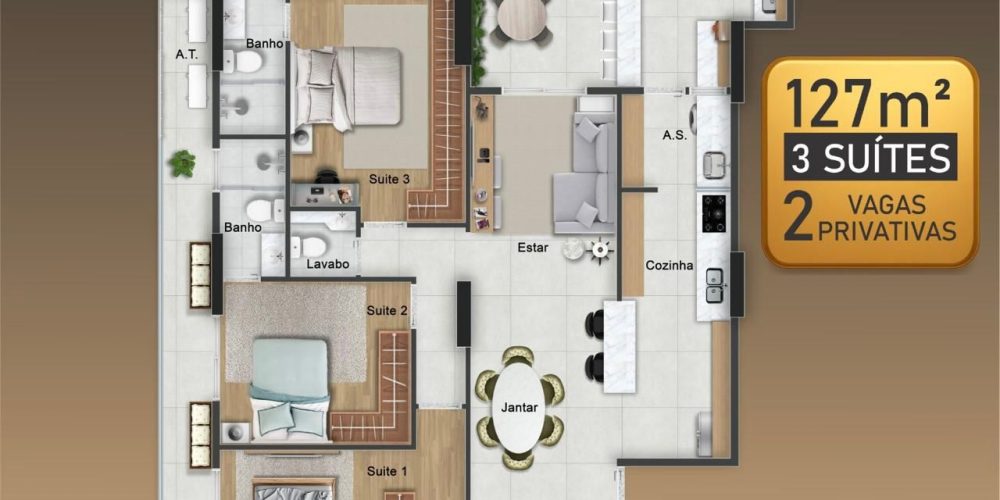 Apartamentos de 3 dormitórios, de 127 a 134 m², com 2 vagas privativas.
