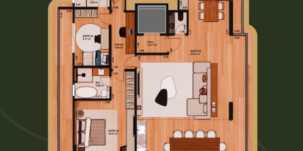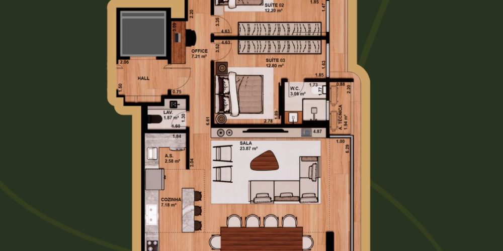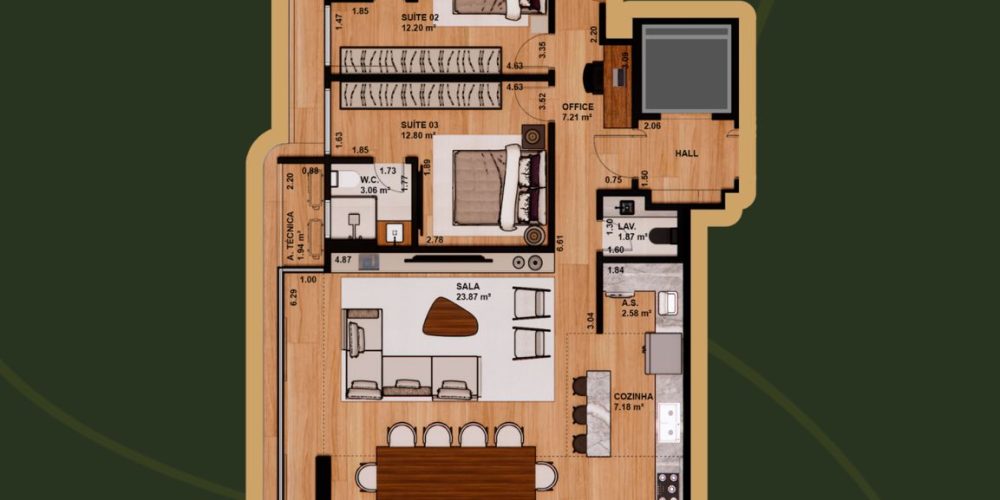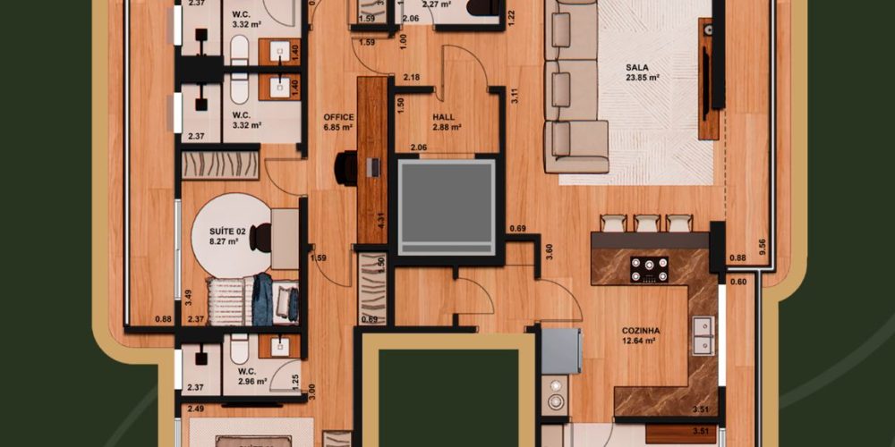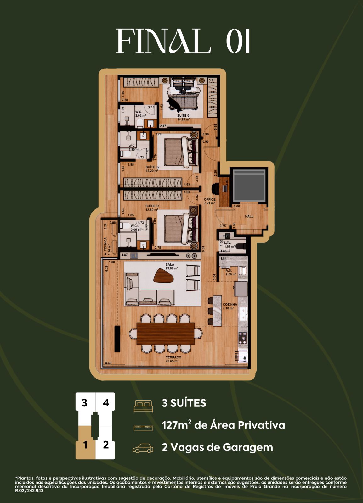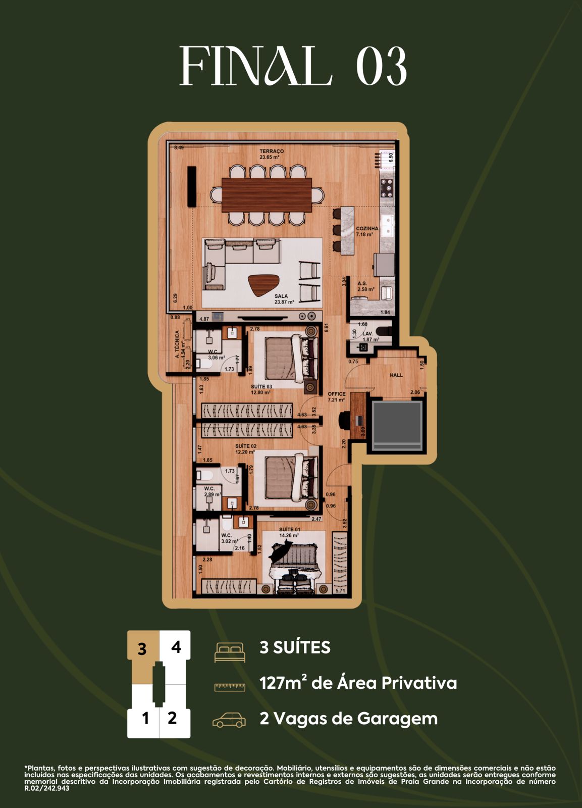 Apartamentos de 3 dormitórios, de 127 a 189 m², com 2 ou 3 vagas de garagem.