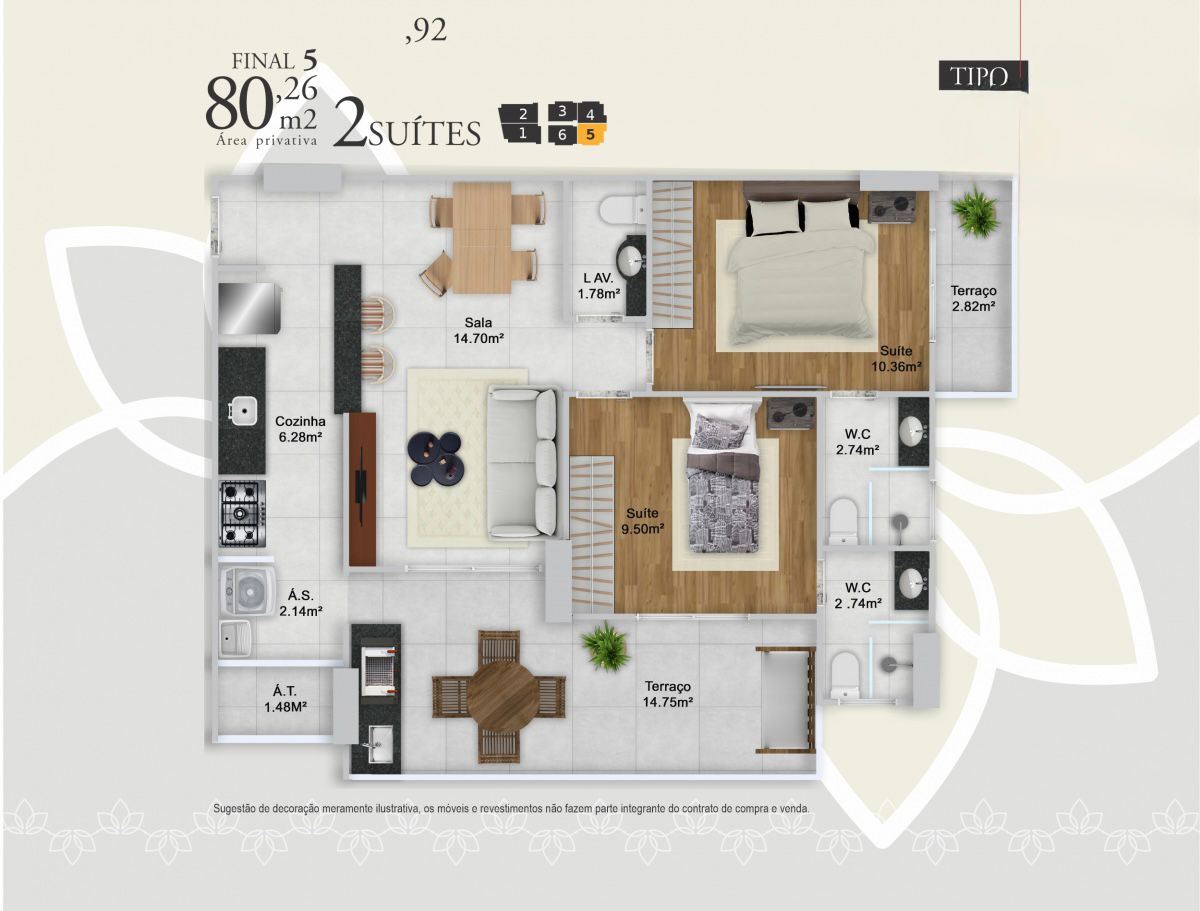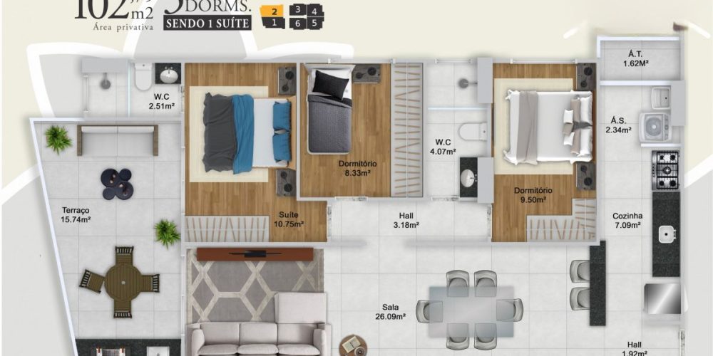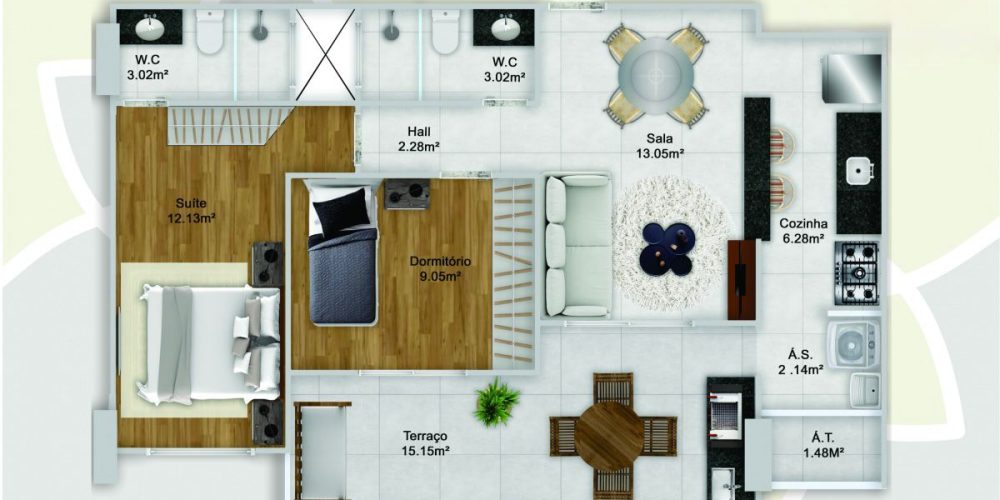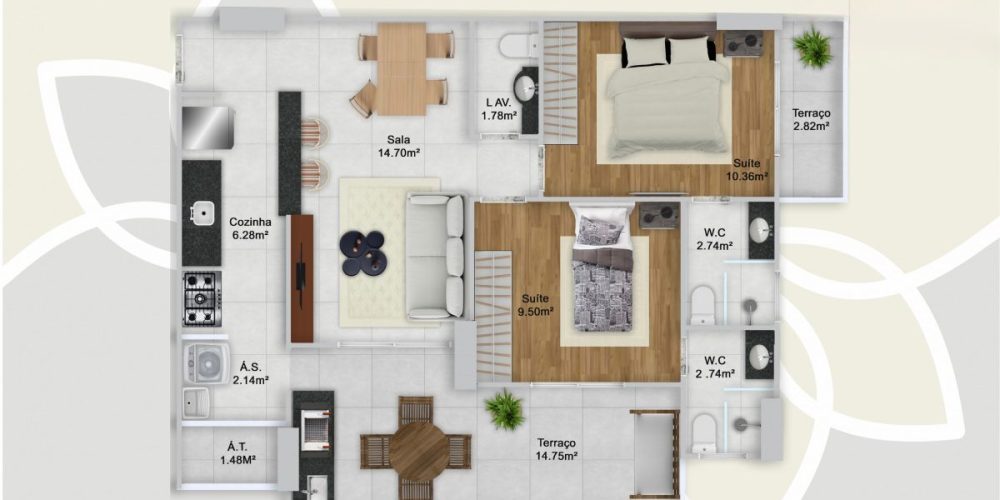 Apartamentos de 2 e 3 dormitórios, de 76 a 103 m², com 1 ou 2 vagas de garagem.